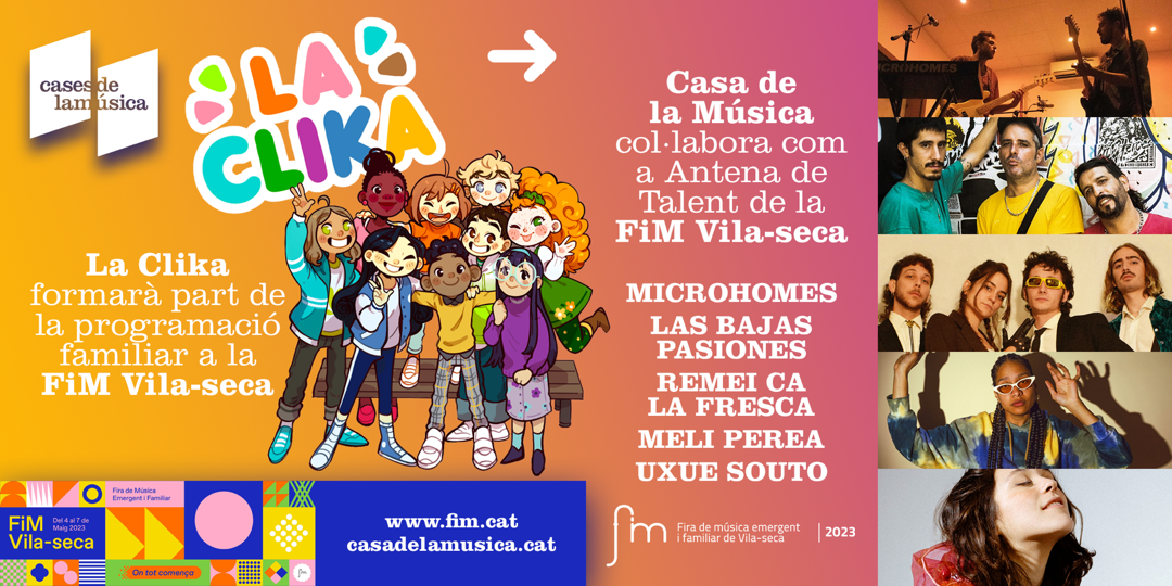 Sense oblidar-nos de La Clika, projecte impulsat per les Cases de la Música, que davant de tot, pretén apropar la música als més petits. Un projecte que es duu a terme des de les aules i que consisteix en l’aprenentatge escolar d’una cantata, formada per onze cançons que fomenten l'autoestima, l'amistat, la diversitat, l'ecologisme o la igualtat de gènere. Tot allò, de la mà de La Clika, una colla d'amics i estudiants de 2n de primària de l’escola imaginària El Rusc. I és que tindran l’oportunitat d’actuar dintre de la programació familiar d’aquesta edició de la FiM de Vila-Seca.