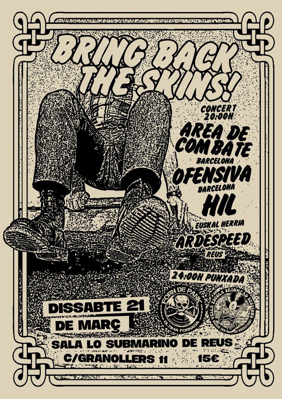 BRING BACK THE SKINS! Preu:15€ anticipada / 18€ a taquilla Lloc: Lo Submarino, Carrer Granollers 11, Reus Hora: Portes: 19:30 h - Inici concert: 20:30 h Bring Back The Skins! Área de Combate (Barcelona) Ofensiva (Barcelona) Hil (Euskal Herria) Ardespeed (Reus) Punxada punk/oi! en vinil Vella Escola Forn de Pank ENTRADES