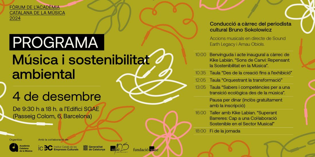 El pròxim dimecres 4 de desembre de 2024, l’Acadèmia Catalana de la Música celebrarà la vuitena edició del seu Fòrum anual a la seu de la SGAE a Barcelona (Passeig de Colom, 6). L’esdeveniment, que tindrà lloc de 9:30 h a 18 h, se centrarà en la importància de la música i el seu sector professional en la transformació ecològica, amb l’objectiu de generar sinergies entre la creació, el mercat, el planeta i la ciutadania. Continguts